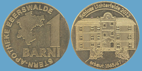 1 Barni; 2012; ausgegeben: 2012/02; Herausgeber: Stern-Apotheke; MB-1Barni-2012-04; Vs.: 1 BARNI - Stern-Apotheke; Rs.: Schloss Lichterfelde – erbaut 1565/67; Stahlkern vermessingt; Dm=23,5mm |