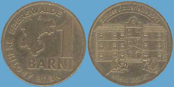 1 Barni; 2012; ausgegeben: 2012/05; Herausgeber: Landbäckerei Hakenbeck; MB-1Barni-2012-13; Vs.: 1 BARNI - Landbäckerei Hakenbeck; Rs.: Friedrichswalde 1748-2012; Stahlkern vermessingt; Dm=23,5mm |