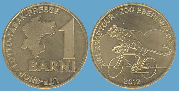 1 Barni; 2012; ausgegeben: 2012/02; Herausgeber: LTP-Shop Lotto Taback Presse; MB-1Barni-2012-06; Vs.: 1 BARNI - LTP-Shop Lotto Taback Presse; Rs.: ZOO Eberswalde – Tigerradtour 2012; Stahlkern vermessingt; Dm=23,5mm |