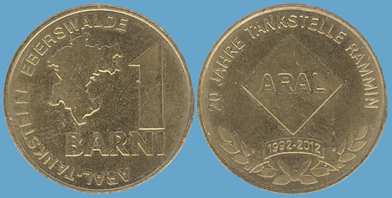1 Barni; 2012; ausgegeben: 2012/03; Herausgeber: ARAL-Tankstelle Eberswalde; MB-1Barni-2012-07; Vs.: 1 BARNI - ARAL-Tankstelle Eberswalde; Rs.: 20 Jahre ARAL-Tankstelle Eberswalde; Stahlkern vermessingt; Dm=23,5mm |