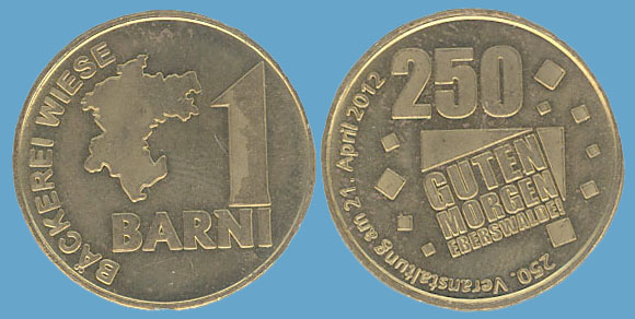 1 Barni; 2012; ausgegeben: 2012/04; Herausgeber: Bäckerei Wiese; MB-1Barni-2012-09; Vs.: 1 BARNI - Bäckerei Wiese; Rs.: 250. Veranstaltung Guten Morgen Eberswalde; Stahlkern vermessingt; Dm=23,5mm |