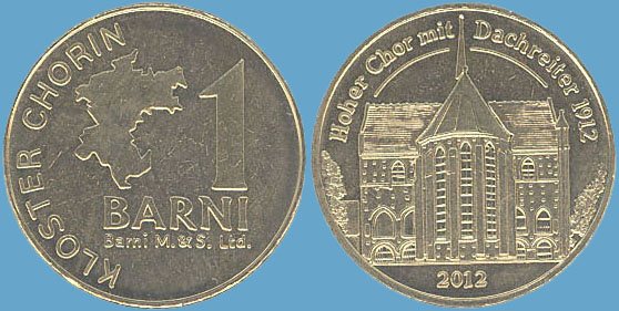 1 Barni; 2012; ausgegeben: 2012/04 u. 12; Herausgeber: BARNI Marketing & Service Ltd.; MB-1Barni-2012-10; Vs.: 1 BARNI - Barni M. & S. Ltd.; Rs.: Hoher Chor mit Dachreiter 1912; Ms Spindelpresse; Dm=23,5mm |