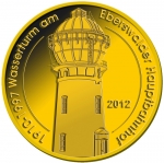 1 Barni; 2012; ausgegeben: 2012/05; Herausgeber: Orthopädie-Schuhtechnik Wassberg; MB-1Barni-2012-12; Vs.: 1 BARNI - Orthopädie-Schuhtechnik Wassberg; Rs.: 1910-1997 Wasserturm am Eberswalder Hauptbahnhof; Stahlkern vermessingt; Dm=23,5mm |