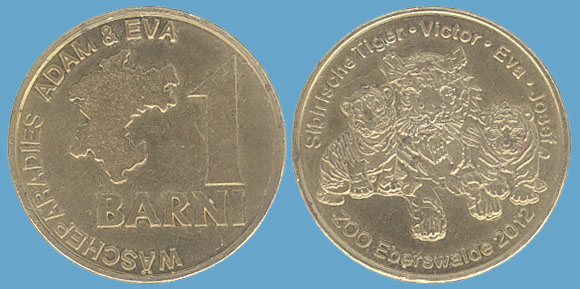 1 Barni; 2012; ausgegeben: 2012/06; Herausgeber: Adam & Eva Wäscheparadies; MB-1Barni-2012-16; Vs.: 1 BARNI - Adam & Eva Wäscheparadies; Rs.: ZOO Eberswalde – Sibirische Tiger Victor, Eva, Josef; Stahlkern vermessingt; Dm=23,5mm |