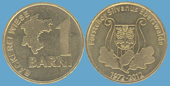 1 Barni; 2012; ausgegeben: 2012/06; Herausgeber: Bäckerei Wiese; MB-1Barni-2012-19; Vs.: 1 BARNI - Bäckerei Wiese; Rs.: Forstchor Silvanus Eberswalde 1972-2012; Stahlkern vermessingt; Dm=23,5mm |