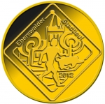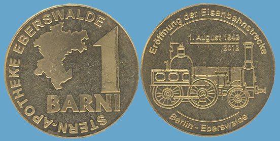 1 Barni; 2012; ausgegeben: 2012/08; Herausgeber: Stern-Apotheke; MB-1Barni-2012-21; Vs.: 1 BARNI - Stern-Apotheke; Rs.: Eröffnung der Eisenbahnstrecke Berlin-Eberswalde 1. August 1842; Stahlkern vermessingt; Dm=23,5mm |