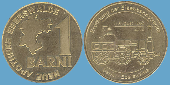 1 Barni; 2012; ausgegeben: 2012/08; Herausgeber: Neue Apotheke; MB-1Barni-2012-22; Vs.: 1 BARNI - Neue Apotheke; Rs.: Eröffnung der Eisenbahnstrecke Berlin-Eberswalde 1. August 1842; Stahlkern vermessingt; Dm=23,5mm |