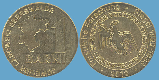 1 Barni; 2012; ausgegeben: 2012/09; Herausgeber: Juwelier & Goldschmiede Lanowski; MB-1Barni-2012-26; Vs.: 1 BARNI - Juwelier & Goldschmiede Lanowski; Rs.: Forstliche Versuchsanstalt Eberswalde Siegel 1922-33; Stahlkern vermessingt; Dm=23,5mm |