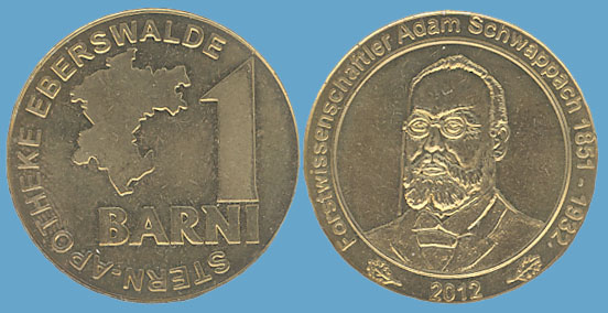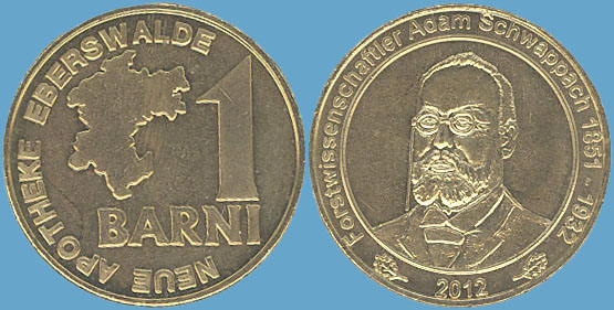 1 Barni; 2012; ausgegeben: 2012/11; Herausgeber: Stern-Apotheke; MB-1Barni-2012-28; Vs.: 1 BARNI - Stern-Apotheke; Rs.: Forstwissenschaftler Adam Schwappach; Stahlkern vermessingt; Dm=23,5mm |