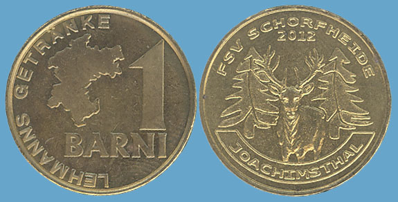 1 Barni; 2012; ausgegeben: 2012/12; Herausgeber: Lehmanns Getränke; MB-1Barni-2012-31; Vs.: 1 BARNI - Lehmanns Getränke; Rs.: FSV SCHORFHEIDE 2012 JOACHIMSTHAL; Stahlkern vermessingt; Dm=23,5mm |