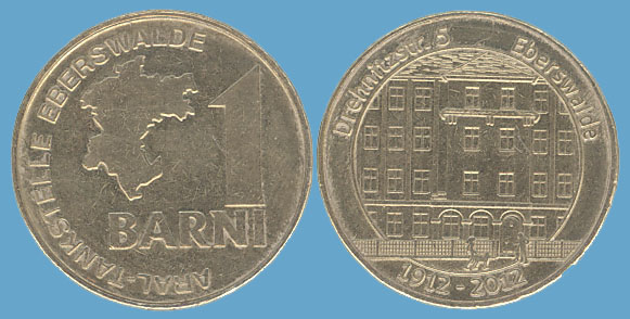 1 Barni; 2012; ausgegeben: 2012/12; Herausgeber: Pinguin-Cafe & Restaurant; MB-1Barni-2012-37; Vs.: 1 BARNI - Pinguin-Cafe & Restaurant; Rs.: Eberswalder Wappen von 1970-1973; Stahlkern vermessingt; Dm=23,5mm |