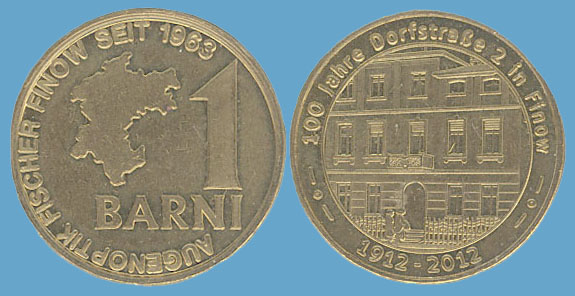 1 Barni; 2012; ausgegeben: 2012/12; Herausgeber: Augenoptik Fischer; MB-1Barni-2012-34; Vs.: 1 BARNI - AUGENOPTIK FISCHER; Rs.: 100 Jahre Dorfstraße 2 In Finow 1912 - 2012; Stahlkern vermessingt; Dm=23,5mm |