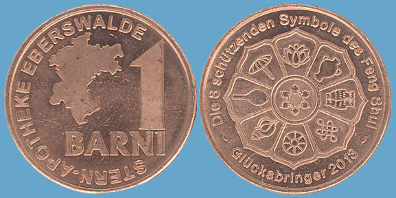 1 Barni; 2013; ausgegeben: 2013/01; Herausgeber: Stern-Apotheke; MB-1Barni-2013-02; Vs.: 1 BARNI - Stern-Apotheke; Rs.: Glücksbringer 2013 – Die 8 schützenden Symbole des Feng Shui; Stahlkern verkupfert; Dm=23,5mm |