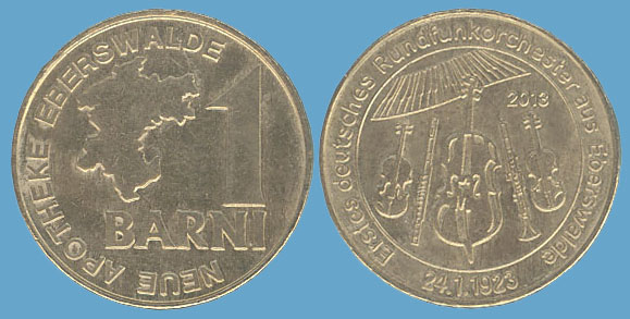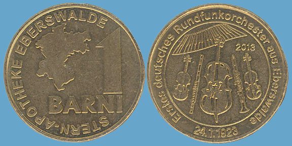 1 Barni; 2013; ausgegeben: 2013/01; Herausgeber: Neue Apotheke; MB-1Barni-2013-03; Vs.: 1 BARNI - Neue Apotheke; Rs.: Erstes deutsches Rundfunk-orchester aus Eberswalde 24.1.1923; Stahlkern vermessingt; Dm=23,5mm |