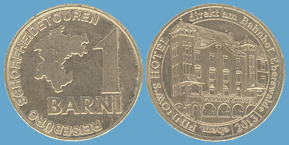1 Barni; 2013; ausgegeben: 2013/03; Herausgeber: Reisebüro Schorfheide Touren; MB-1Barni-2013-06; Vs.: 1 BARNI - Reisebüro Schorfheide Touren; Rs.: ehem. Pinnow´s Hotel, direkt am Bahnhof Eberswalde; Stahlkern vermessingt; Dm=23,5mm |