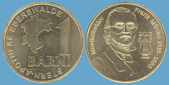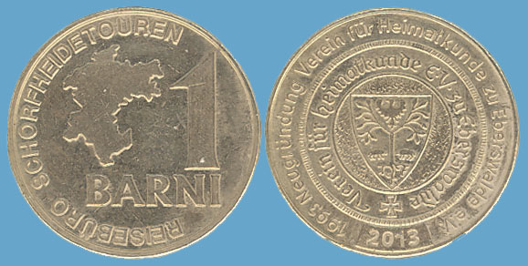 1 Barni; 2013; ausgegeben: 2013/03; Herausgeber: Reisebüro Schorfheide Touren; MB-1Barni-2013-08; Vs.: 1 BARNI - Reisebüro Schorfheide Touren; Rs.: 1993 Neugründung Verein für Heimatkunde zu Eberswalde e.V.; Stahlkern vermessingt; Dm=23,5mm |
