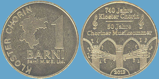 1 Barni; 2013; ausgegeben: 2013/03 u. 12; Herausgeber: BARNI Marketing & Service Ltd.; MB-1Barni-2013-09; Vs.: 1 BARNI - Barni M. & S. Ltd.; Rs.: 740 Jahre Kloster Chorin - 50 Jahre Choriner Musiksommer; Ms (Spindelpresse); Stahlkern vermessingt; Dm=23,5mm |
