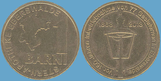 1 Barni; 2013; ausgegeben: 2013/04; Herausgeber: Stern-Apotheke; MB-1Barni-2013-11; Vs.: 1 BARNI - Stern-Apotheke; Rs.: Vor 150 Jahren Inbetriebnahme von 77 Gaslaternen in Eberswalde; Stahlkern vermessingt; Dm=23,5mm |