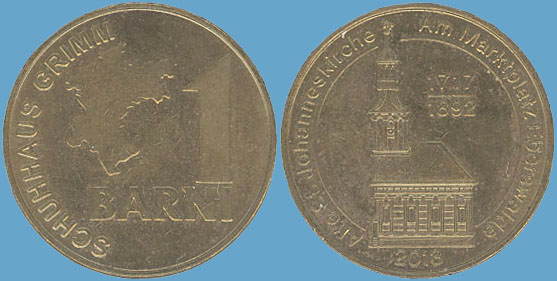 1 Barni; 2013; ausgegeben: 2013/05; Herausgeber: Schuhhaus Grimm; MB-1Barni-2013-12; Vs.: 1 BARNI - Schuhhaus Grimm; Rs.: Alte St. Johanneskirche, Am Marktplatz Eberswalde 1717-1892; Stahlkern vermessingt; Dm=23,5mm |