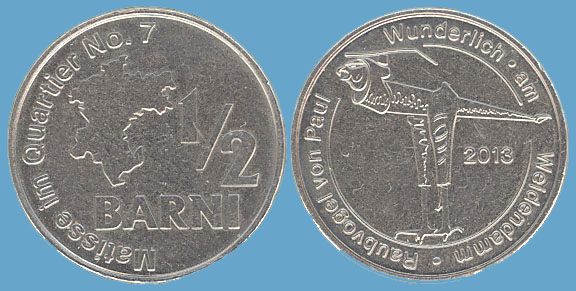 1/2 Barni; 2013; ausgegeben: 2013/06; Herausgeber: Matisse im Quartier No. 7; MB-1Barni-2013-13; Vs.: 1/2 BARNI - Matisse im Quartier No. 7; Rs.: Raubvogel von Paul Wunderlich, am Weidendamm; Stahlkern vernickelt; Dm=23,5mm |