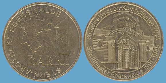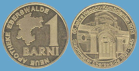 1 Barni; 2013; ausgegeben: 2013/07; Herausgeber: Neue Apotheke; MB-1Barni-2013-16; Vs.: 1 BARNI - Neue Apotheke; Rs.: 65 Jahre Waggon-Komödianten, Stadttheater Eberswalde 1891-1945; Stahlkern vermessingt; Dm=23,5mm |