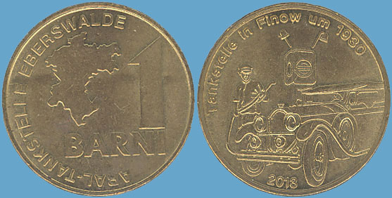 1 Barni; 2013; ausgegeben: 2013/09; Herausgeber: ARAL-Tankstelle Eberswalde; MB-1Barni-2013-19; Vs.: 1 BARNI - ARAL-Tankstelle Eberswalde; Rs.: Tankstelle in Finow um 1930 - 2013; Stahlkern vermessingt; Dm=23,5mm |