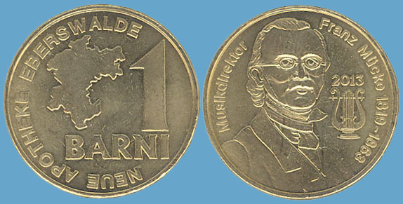 1 Barni; 2013; ausgegeben: 2013/10; Herausgeber: Neue Apotheke; MB-1Barni-2013-21; Vs.: 1 BARNI - Neue Apotheke; Rs.: Musikdirektor Franz Mücke 1819-1863; Stahlkern vermessingt; Dm=23,5mm |