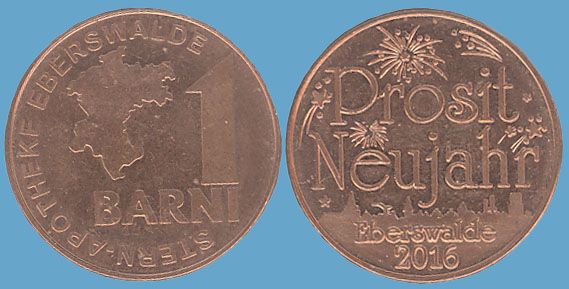 1 Barni; 2016; ausgegeben: 2016/01; Herausgeber: Stern-Apotheke; MB-1Barni-2016-01; Vs.: 1 BARNI - Stern-Apotheke; Rs.: Prosit Neujahr, Eberswalde 2016; Stahlkern verkupfert; Dm=23,5mm |