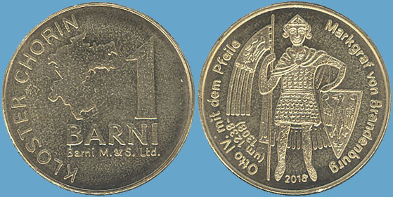1 Barni; 2016; ausgegeben: 2016/03 und 12; Herausgeber: BARNI Marketing & Service Ltd.; MB-1Barni-2016-07; Vs.: 1 BARNI - Barni M. & S. Ltd.; Rs.: Otto IV. (um 1226-1306) mit dem Pfeile - Markgraf von Brandenburg 2016; Ms (Spindelpresse); Dm=23,5mm |