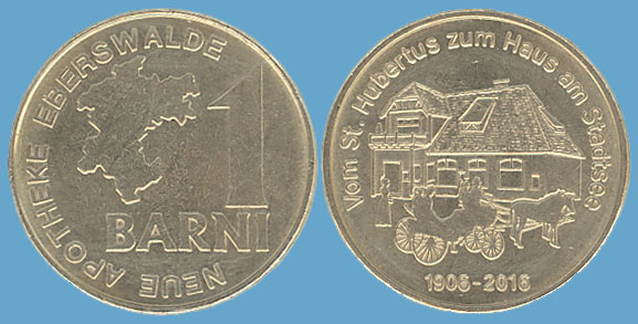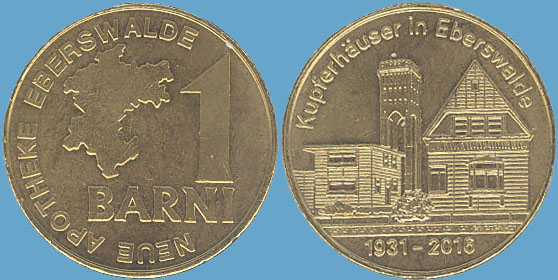 1 Barni; 2016; ausgegeben: 2016/04; Herausgeber: Neue Apotheke Eberswalde; MB-1Barni-2016-08; Vs.: 1 BARNI - NEUE APOTHEKE EBERRSWALDE; Rs.: Kupferhäuser in Eberswalde 1931-2016; Stahlkern (vermessingt); Dm=23,5mm |