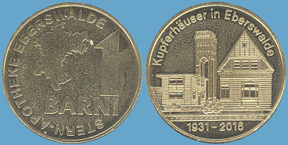 1 Barni; 2016; ausgegeben: 2016/04; Herausgeber: Stern-Apotheke Eberswalde; MB-1Barni-2016-09; Vs.: 1 BARNI - STERN-APOTHEKE EBERRSWALDE; Rs.: Kupferhäuser in Eberswalde 1931-2016; Stahlkern (vermessingt); Dm=23,5mm |