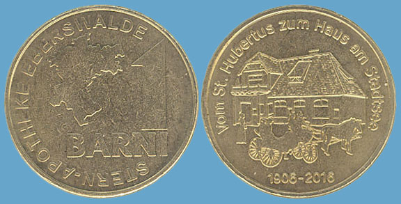 1 Barni; 2016; ausgegeben: 2016/07; Herausgeber: Neue Apotheke; MB-1Barni-2016-11; Vs.: 1 BARNI - Neue Apotheke; Rs.: Vom St. Hubertus zum Haus am Stadtsee 1906-2016; Stahlkern vermessingt; Dm=23,5mm |