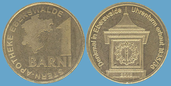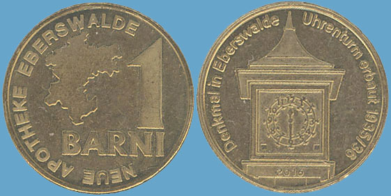 1 Barni; 2016; ausgegeben: 2016/09; Herausgeber: Stern-Apotheke; MB-1Barni-2016-12; Vs.: 1 BARNI - Stern-Apotheke; Rs.: Denkmal in Eberswalde Uhrenturm erbaut 1935/36; Stahlkern verkupfert; Dm=23,5mm |