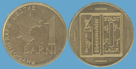 1 Barni; 2016; ausgegeben: 2016/09; Herausgeber: Physiotherapie & Podologie S. Liedtke; MB-1Barni-2016-14; Vs.: 1 BARNI - Physiotherapie & Podologie S. Liedtkei; Rs.: 10. Eberswalder Stadtlauf; Nordig-Gold; Dm=23,5mm |