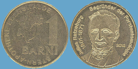 1 Barni; 2016; ausgegeben: 2016/12; Herausgeber: Stern-Apotheke; MB-1Barni-2016-19; Vs.: 1 BARNI - Stern-Apotheke; Rs.: Julius Ratzeburg 1801-1871 Begründerder Forstentomologie; Nordig-Gold; Dm=23,5mm |
