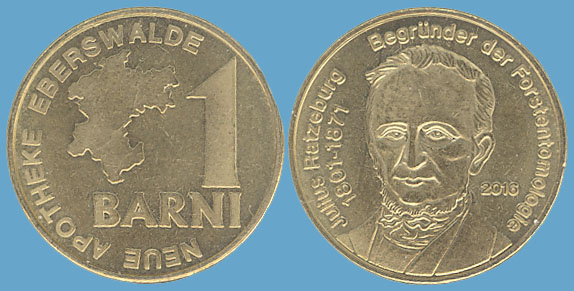 1 Barni; 2016; ausgegeben: 2016/12; Herausgeber: Neue Apotheke; MB-1Barni-2016-20; Vs.: 1 BARNI - Neue Apotheke; Rs.: Julius Ratzeburg 1801-1871 Begründerder Forstentomologie; Nordig-Gold; Dm=23,5mm |