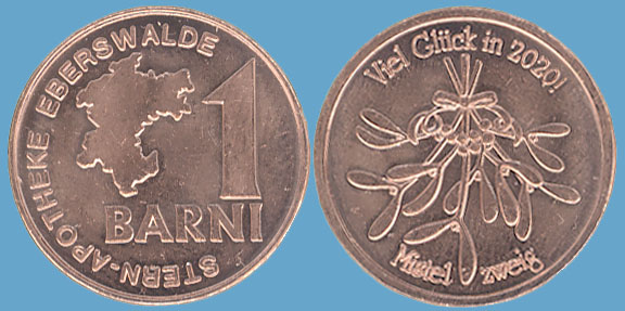 1 Barni; 2020; ausgegeben: 2020/01; Herausgeber: Stern-Apotheke; MB-1Barni-2020-01; Vs.: 1 BARNI - Stern-Apotheke Eberswalde; Rs.: Viel Glück 2020! Mistelzweig; Stahlkern verkupfert; Dm=23,5mm |