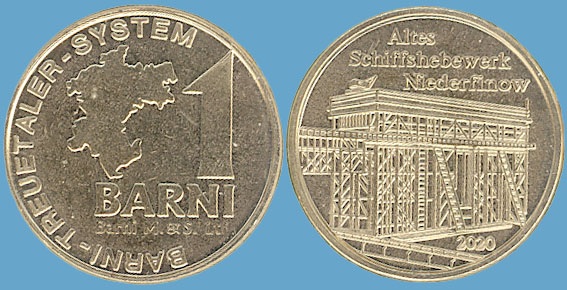1 Barni; 2020; ausgegeben: 2020/05; Herausgeber: BARNI Marketing & Service Ltd.; MB-1Barni-2020-03; Vs.: 1 BARNI - BARNI M. & S. Ltd.; Rs.: Alters Schiffshebewerk Niederfinow; Nordig-Gold; Dm=23,5mm |