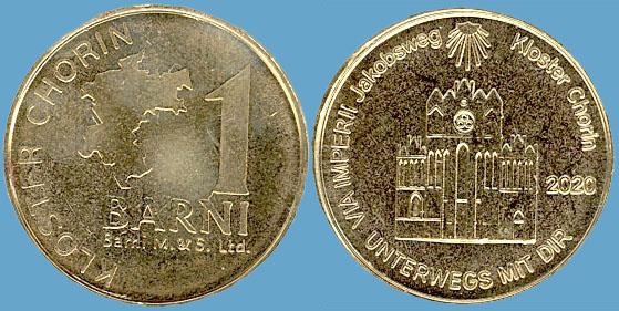 1 Barni; 2020; ausgegeben: 2020/05; Herausgeber: BARNI Marketing & Service Ltd.; MB-1Barni-2020-04; Vs.: 1 BARNI - BARNI M. & S. Ltd.; Rs.: VIA IMPERII JAKOBSWEG KLOSTER CHORIN - UNERWEGS MIT DIR; Nordig-Gold; Dm=23,5mm |