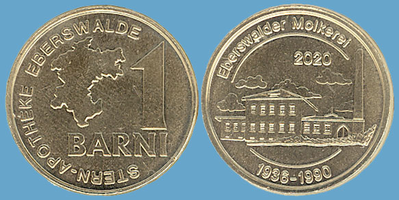 1 Barni; 2020; ausgegeben: 2020/11; Herausgeber: Stern-Apotheke; MB-1Barni-2020-06; Vs.: 1 BARNI - Stern-Apotheke; Rs.: Eberswalder Molkerei / 2020 / 1936-1990; Nordig-Gold; Dm=23,5mm |