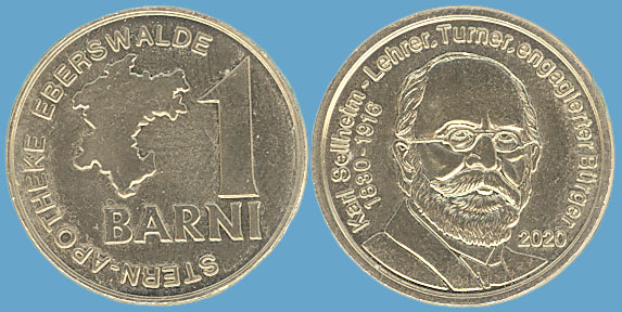 1 Barni; 2020; ausgegeben: 2020/11; Herausgeber: Stern-Apotheke; MB-1Barni-2020-07; Vs.: 1 BARNI - Stern-Apotheke; Rs.: Karl Sellheim - Lehreer, Turner, engagierter Bürger / 1890-1916 / 2020; Nordig-Gold; Dm=23,5mm |