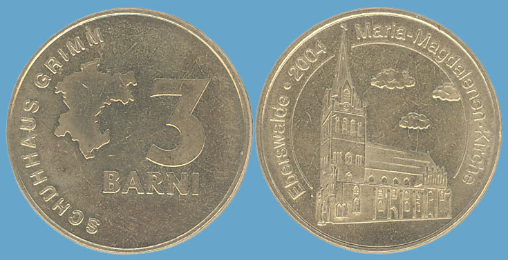 3 Barni; 2004; ausgegeben: 2004/10; Herausgeber: Schuhhaus Grimm; MB-3Barni-2004-07; Vs.: 3 Barni - Schuhhaus Grimm; Rs.: Maria-Magdalenen-Kirche; Messing Goldfarbig; Dm=30,22mm; Zeichnung: n.h.s. |