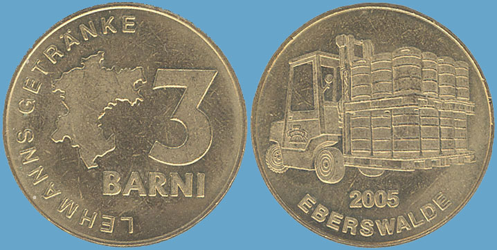3 Barni; 2005; ausgegeben: 2005/01; Herausgeber: Lehmanns Getränke; MB-3Barni-2005-02; Vs.: 3 Barni - Lehmanns Getränke; Rs.: Stapler - Lehmanns Getränke; Messing Goldfarbig; Dm=30,22mm; Zeichnung: n.h.s. |