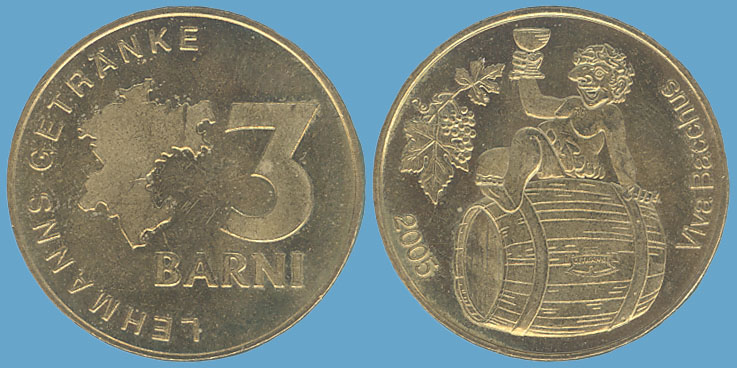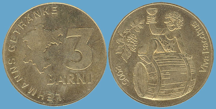 3 Barni; 2005; ausgegeben: 2005/09; Herausgeber: Lehmanns Getränke; MB-3Barni-2005-04; Vs.: 3 Barni - Lehmanns Getränke; Rs.: Viva Bacchus (ohne Logo); Messing Goldfarbig; Dm=30,22mm; Zeichnung: n.h.s. |
