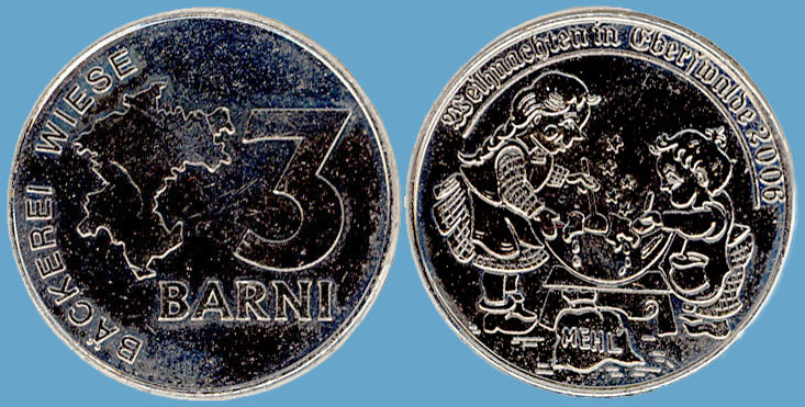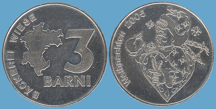 3 Barni; 2005; ausgegeben: 2005/12; Herausgeber: Bäckerei Wiese; MB-3Barni-2005-06; Vs.: 3 Barni - Bäckerei Wiese; Rs.: Weihnachten 2005; Messing vernickelt (silberfarbig); Dm=30,22mm; Zeichnung: Dorina Andress |