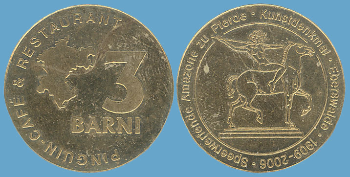 3 Barni; 2006; ausgegeben: 2006/02; Herausgeber: Pinguin-Cafe & Restaurant; MB-3Barni-2006-05; Vs.: 3 Barni - Pinguin-Cafe & Restaurant; Rs.: Speerwerfende Amazone zu Pferde, Kunstdenkmal Eberswalde 1909-2006; Messing Goldfarbig; Dm=30,22mm |