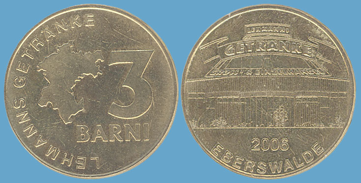 3 Barni; 2006; ausgegeben: 2006/05; Herausgeber: Lehmanns Getränke; MB-3Barni-2006-07; Vs.: 3 Barni - Lehmanns Getränke; Rs.: Geschäft Lehmanns Getränke; Messing Goldfarbig; Dm=30,22mm |