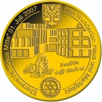 3 Barni; 2007; ausgegeben: 2007/07; Herausgeber: Rotary Club; MB-3Barni-2007-02; Vs.: 3 Barni - Rotary Club; Rs.: Eberswalde „Neue Mitte“, Paul-Wunderlich-Haus und Marktplatz; Messing Goldfarbig; Dm=30,22mm; Zeichnung: n.h.s.; Auflage: 1.000 Stück; Spendenbarni |