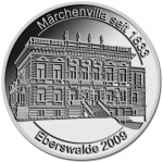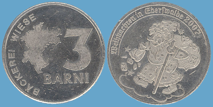 3 Barni; 2009; ausgegeben: 2009/12; Herausgeber: Bäckerei Wiese; MB-3Barni-2009-06; Vs.: 3 Barni - Bäckerei Wiese; Rs.: Märchenvilla in Eberswalde seit 1833; Messing vernickelt (silberfarbig); Dm=30,22mm |