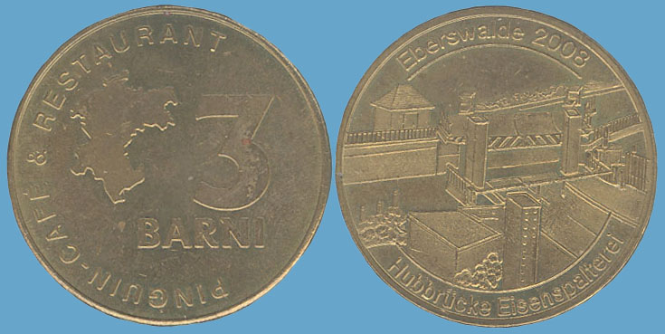 3 Barni; 2008; ausgegeben: 2008/03; Herausgeber: Pinguin-Cafe & Restaurant; MB-3Barni-2008-03; Vs.: 3 Barni - Pinguin-Cafe & Restaurant; Rs.: Hubbrücke Eisenspalterei; Messing Goldfarbig; Dm=30,22mm |